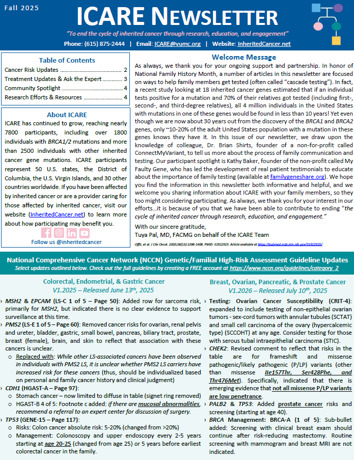 ICARE provides participants with periodic updates on the latest scientific findings about clinical cancer genetics and new research protocols or projects for which they may be eligible through newsletters, electronic information transfer, and/or other approaches.