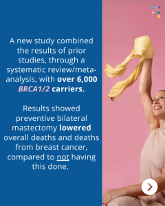 A new study that combined the results of prior studies (through a systematic review/meta-analysis) including a total of over 6000 BRCA1/2 carriers showed that preventive bilateral mastectomy lowered overall deaths as well as deaths from breast cancer, compared to not having this done.