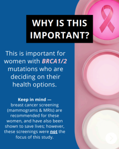 This information is important as women with BRCA1/2 mutations are deciding on their health options. Keep in mind, breast cancer screening (through mammograms and MRIs) are recommended for these women, and have also been shown to save lives; however, these screenings were not the focus of this study.