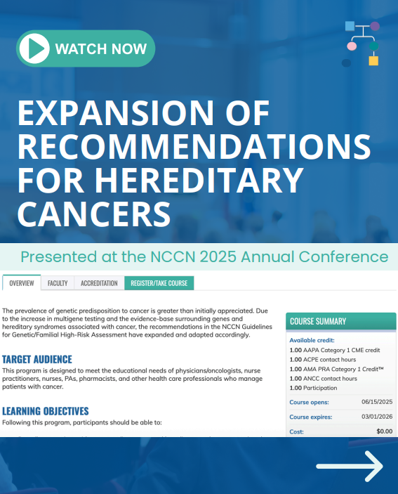 Watch an exciting presentation from the National Comprehensive Cancer Network (NCCN) 2025 Annual Conference, during which several experts in the field of inherited cancer discuss genes related to prostate, endometrial, and gastric cancers as well as the expanded recommendations in the NCCN Guidelines for Genetic/Familial High-Risk Assessment.