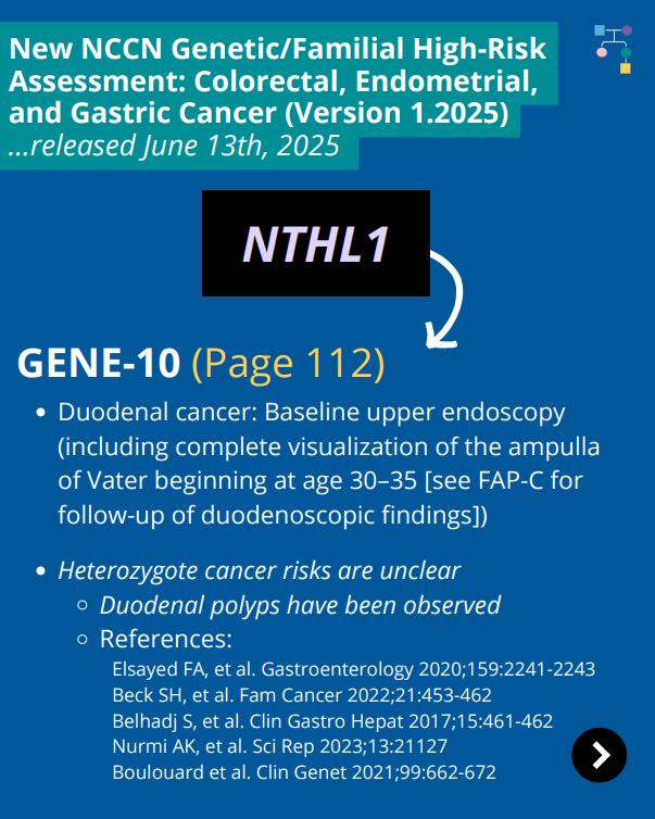 The National Comprehensive Cancer Network (NCCN) released updated Genetic/Familial High-Risk Assessment: Colorectal, Endometrial, Gastric Cancer guidelines on June 13th, 2025 (Version 1.2025). Included in these new guidelines are updates to the NTHL1 content.