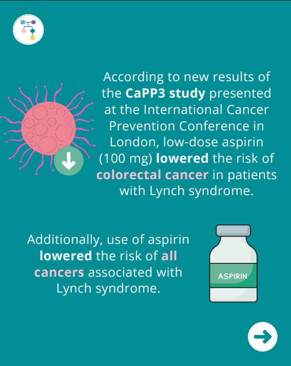 According to new results of the Colorectal Adenoma/Carcinoma Prevention Program 3 (CaPP3) study presented at the International Cancer Prevention Conference in London, low-dose aspirin (100 mg) lowered the risk of colorectal cancer in patients with Lynch syndrome. Additionally, the use of aspirin lowered the risk of all cancers associated with Lynch syndrome.