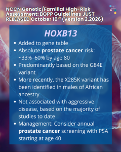 The National Comprehensive Cancer Network (NCCN) released updated prostate cancer guideline for HOXB13 in the new Genetic/Familial High-Risk Assessment: Breast, Ovarian, Pancreatic, and Prostate Cancer guidelines (Version 2.2026) published today! Check out the full guidelines by creating a FREE account at:https://www.nccn.org/professionals/physician_gls/pdf/genetics_bopp.pdf